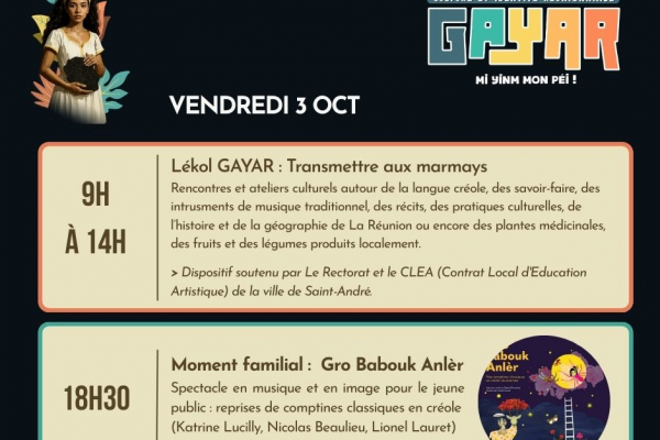 Ateliers de découverte autour de la langue créole, du maloya et des instruments traditionnels, de l’histoire, de la géographie, initiation à la radio, rencontre avec les artistes et spectacle vivant…Autant de propositions ludiques et sensibles pour animer les sens des jeunes et leur xpermettre une meilleure lecture de leurs racines. Une journée d’éveil, de transmission et de partage autour des valeurs réunionnaises.